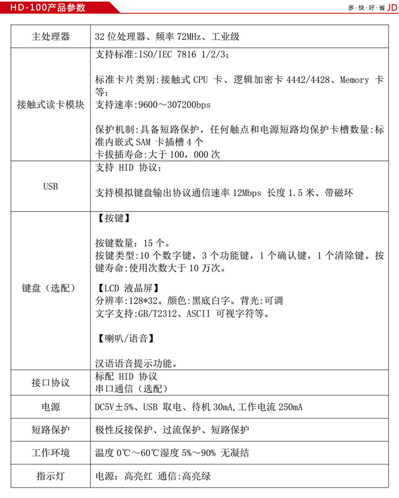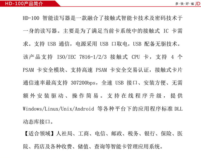 華大HD-100醫保卡智能卡讀寫器是一款融合了接觸式智能卡技術及密碼技術于一身的讀寫器。主要是為了滿足當前卡系統中的接觸式 IC 卡需求。支持 USB 通信,電源采用 USB 口取電,USB 配備無驅技術。該產品支持 ISO/IEC 7816-1/2/3 接觸式 CPU 卡,支持 4 個 PSAM 卡安全模塊、支持高速 PSAM 卡安全交易認證,接觸式卡片通信速率最高支持 307200bps,全速 USB 接口、安裝方便、無需額外安裝驅動、操作簡易。支持在線程序升級,提供 Windows/Linux/Unix/Android 等各種平臺下的應用程序標準DLL 動態庫接口。